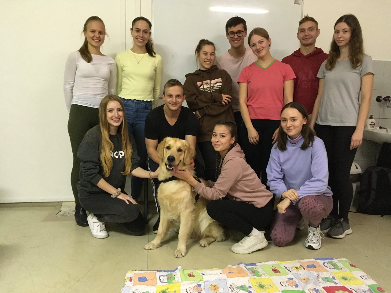 foto pořízeno na Univerzitě Palackého se studenty Fyzioterapie - předmět CANISTERAPIE listopad 2022